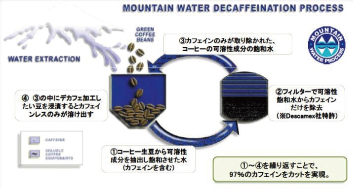 同社は、水抽出法の一種である**「マウンテン・ウォータ・プロセス(Mountain Water Process)」**の製造工程における特許を保有する、カフェインレス加工の専門企業です。