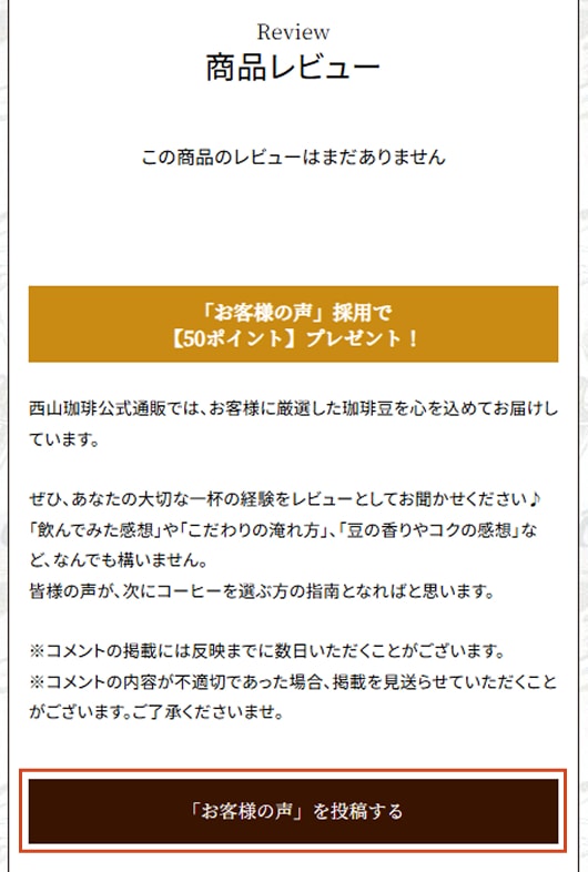 - レビューを投稿頂くには、西山珈琲公式通販での会員登録及びログインが必要となります。