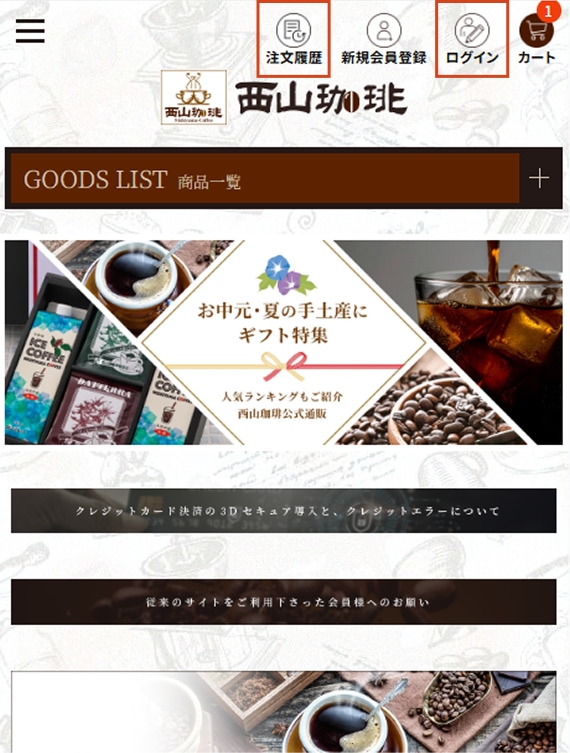 ページ上部の「注文履歴」もしくは「ログイン」アイコンからMYページへ。